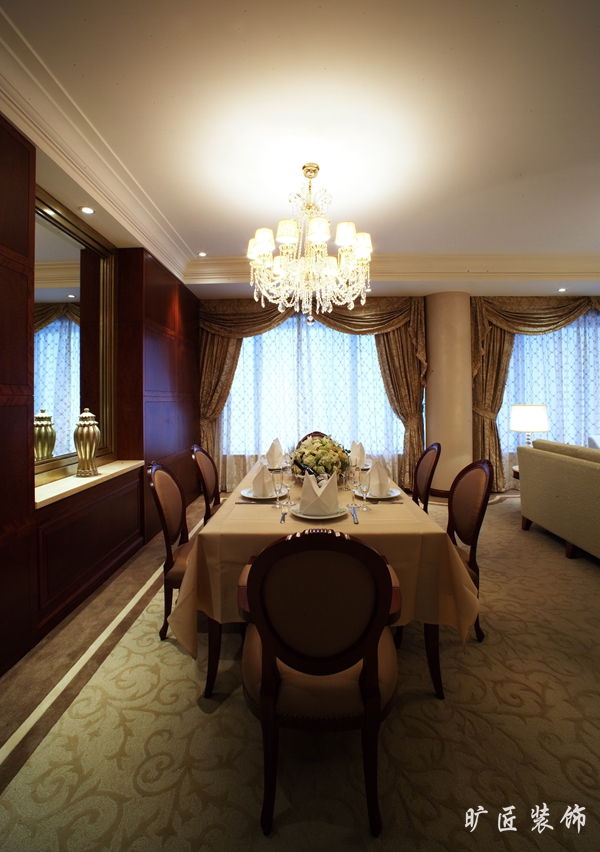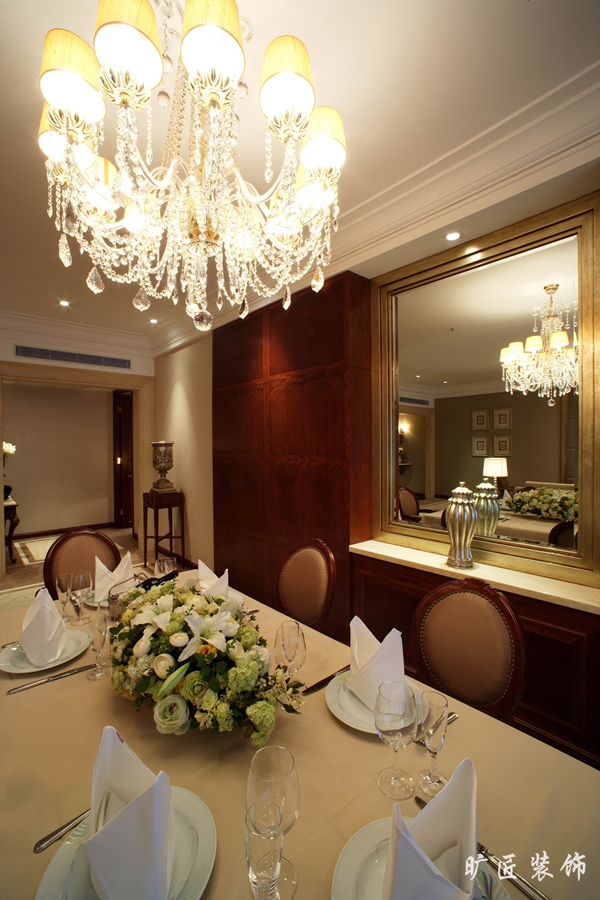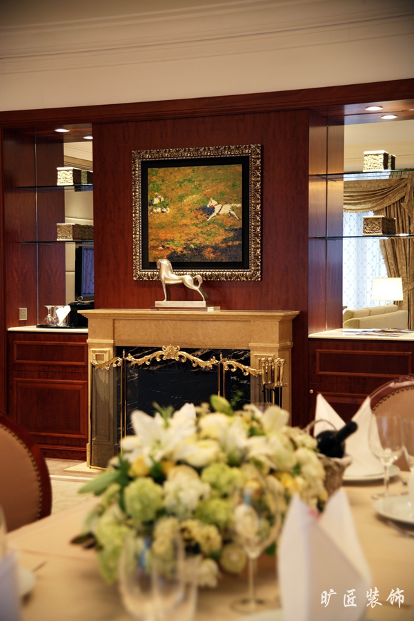 極具藝術氛圍的餐廳,蕩漾著的浪漫曲線充滿了整個空間。人與動物雕塑的曲線,酒杯的曲線以及墻面上蜿蜒折返的線條,無不令人遐想。在整個優雅的氛圍中,上方大氣的玻璃吊燈與餐桌上下呼應,形成了居室中一道亮麗的風景線。若不是桌上擺放著餐具,這里更像是藝術工作室的一角。