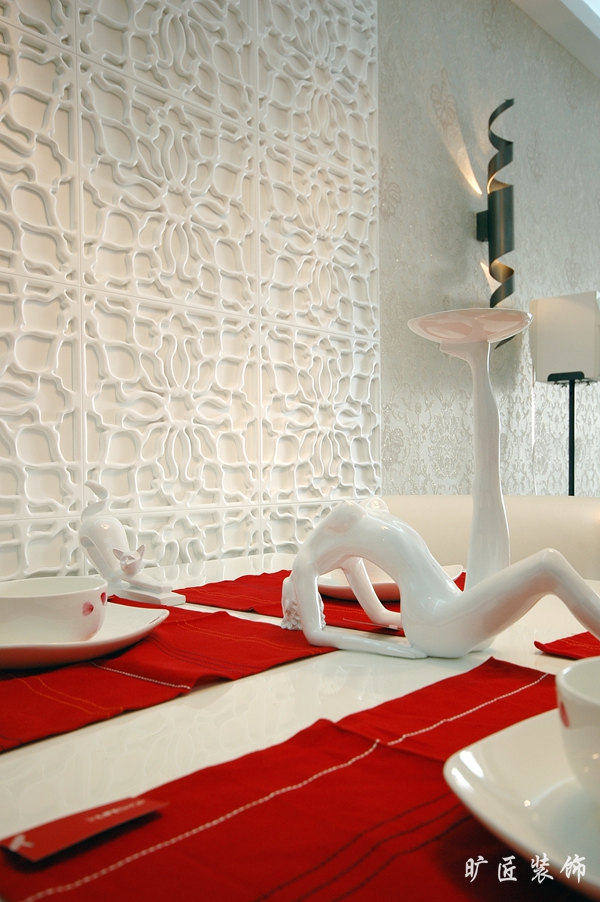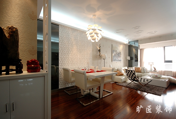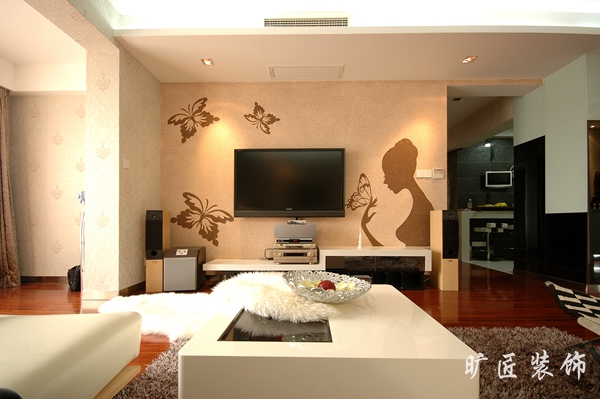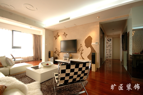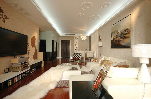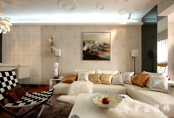 客廳以淡雅的色彩為主調,配以同色系的布衣沙發和燈飾,盡顯舒適和優雅。白色的毛毯傳達出浪漫唯美的感情,金銀二色的靠墊則彰顯著貴族的氣質。墻上的剪影勾勒出女人優美的線條,還有靈動的蝴蝶,給客廳增添了一抹柔美的誘惑和生動的色彩,熠熠生輝的活力。黃色的光暈傾灑在油畫上,渾然一體,仿佛油畫上的一輪夕陽,綻放出祥和溫暖的光彩。