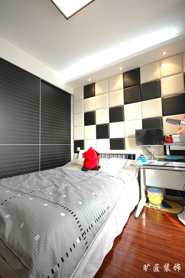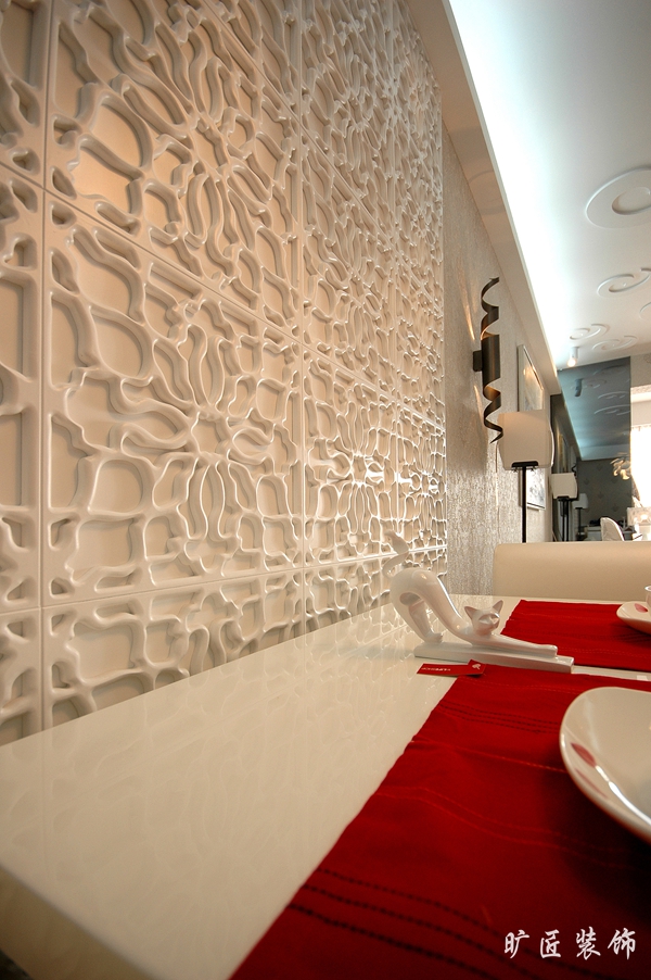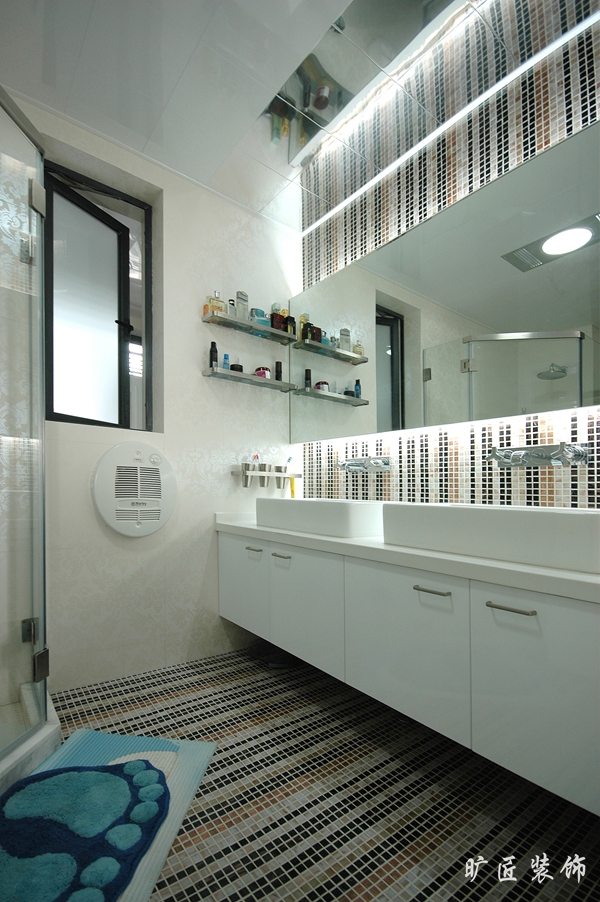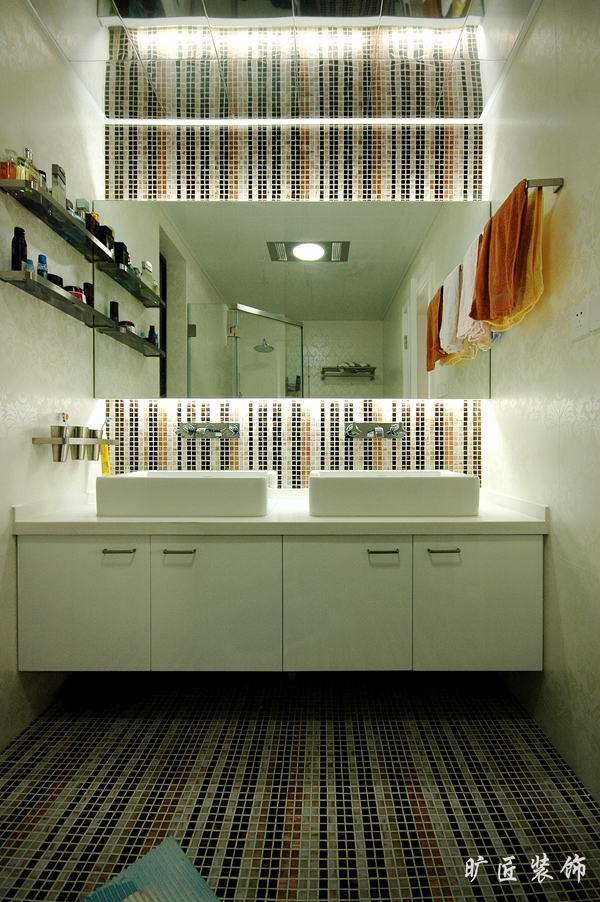衛生間的設計獨具匠心,馬賽克拼貼的縱向條紋圖案從墻壁延伸至地面,猶如瀑布傾瀉使空間內的線條流動起來,也為簡約基調的衛生間帶來別樣的神秘氣質,增加了空間層次感又兼具裝飾感。