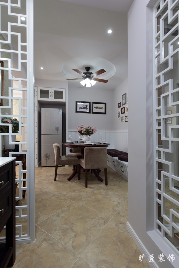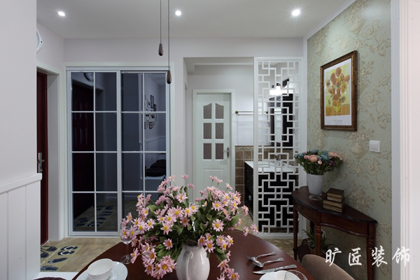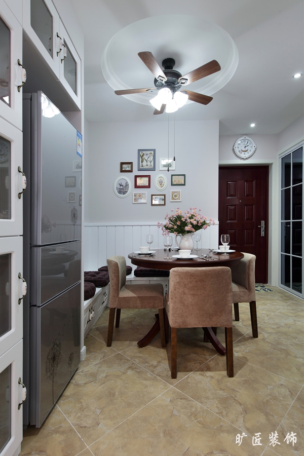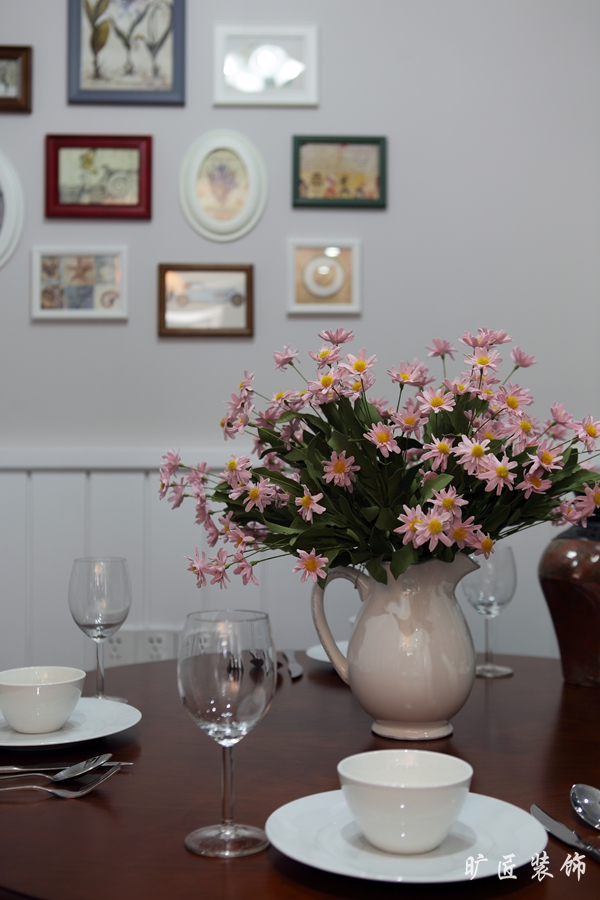 戶型面積雖不是很大但功能設備樣樣齊全,特別是餐廳的設計上,考慮到餐廳的面積較小于是設計師索性便在墻面設計了一排坐凳既不浪費空間還可以用來存儲東西 可謂巧妙之極!在后期的軟裝搭配上設計師也很用心,在整體白色的環境下設計師用了偏暖色的調子軟裝飾品來搭配!使整個空間瞬間就變得溫暖、溫馨、浪漫而又美觀!
