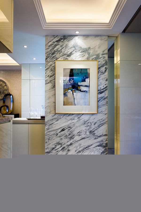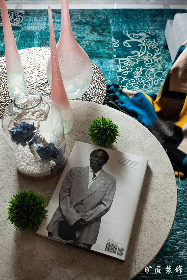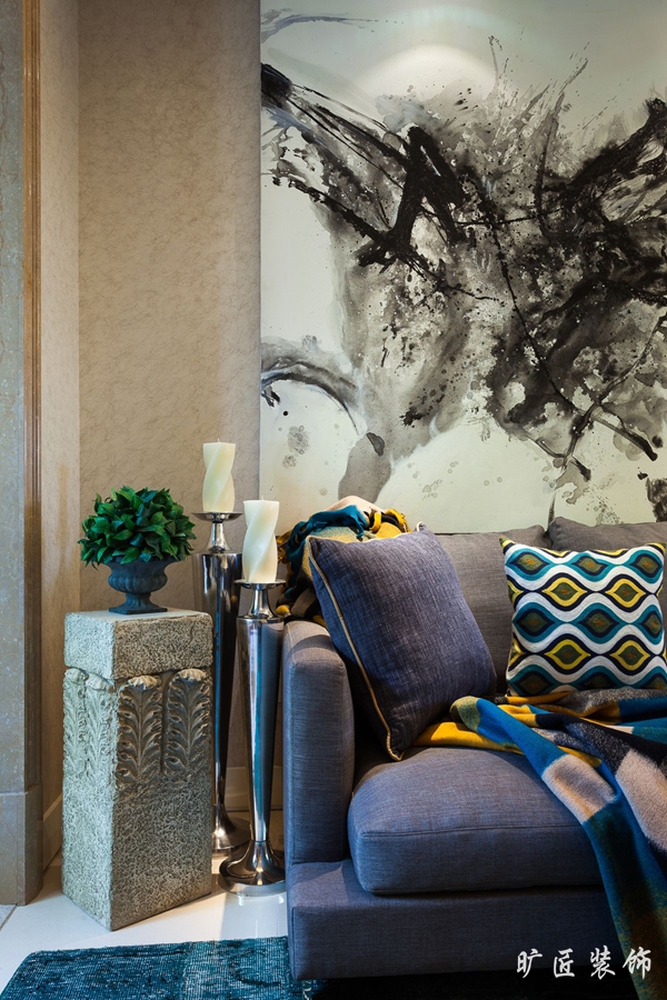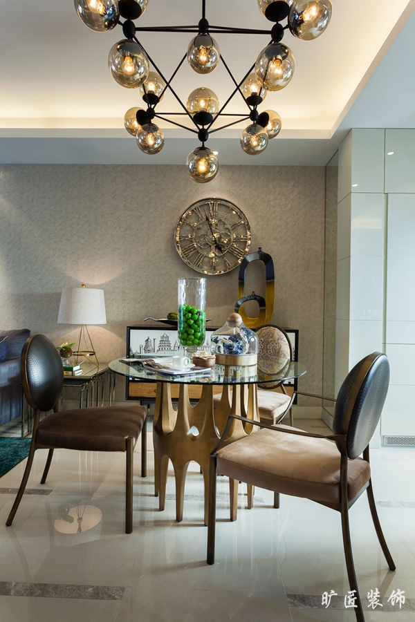 鮮明的色彩對比,大膽夸張的修飾,將現代時尚風格演繹得如此不拘一格!亮黃色的電視背景從整個居室環境中跳脫出來,第一時間吸引了人們的眼球。紫檀色的沙發,配上墻上的那幅抽象的水墨畫,頗有現代味道。客廳延伸出去隨即是餐廳,整個銜接和過度又是那么自然、和諧,金色的掛鐘和燈具,和餐桌餐椅的顏色相映襯,書房內的一些金屬掛飾和擺件讓這個居室充滿質感和時尚的味道,才華和愛好仿佛在生活中流淌。