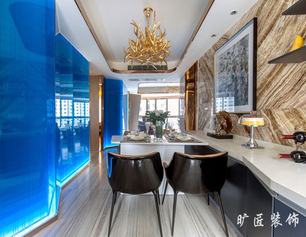 用色大膽,敢于嘗試一些小眾的顏色,玄關、電視背景墻以及一些掛畫或是小擺件等,無不彰顯著主人特立獨行的性格特點。居室主人甚至將中國傳統的元素非常靈活巧妙地用到了各個細節處,比如:電視柜的造型雕刻、電視背景的一些碉樓、臥室的類似窗欞雕花的隔斷、客廳上方富有設計感的吊頂以及隨處可見的一些帶有濃厚中國風的小物件,餐廳的那一男一女的中國娃娃掛畫特別有味道,還有玄關處柜子上的獅子繡球,桌上的陶瓷瓶,臥室的燈具,到處都可感受到一股濃濃的中國風撲面而來,卻又帶著一絲俏皮,緩緩而至。