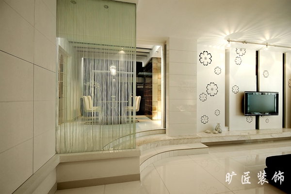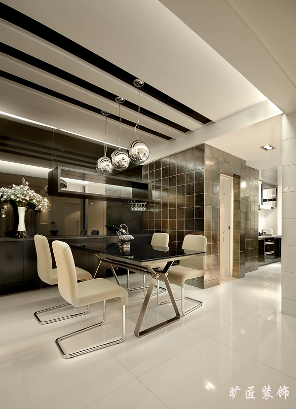 這是一個黑與白共同締造的光影世界。白色的質感,黑色的沉穩,加上大理石、瓷磚、吊飾、燈光的共同裝飾效果,打造了一個極簡、現代化十足的光影的天地。開放式廚房和餐廳實現了空間上的聯通,整個廚餐廳變得寬敞大氣。客廳也是通透明亮,整個居室的設計都彰顯了主人的前衛的品位和熱情好客的個性。