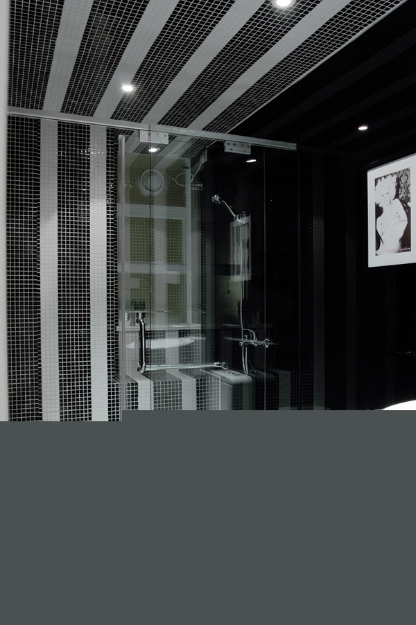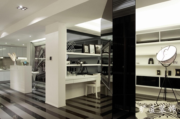 伴隨著可推動進而旋轉(zhuǎn)的黑色電視墻,起居室與工作間在類似游戲的方式中進行置換,當(dāng)然,即便是在進餐和品酒時也少不了看看電視。