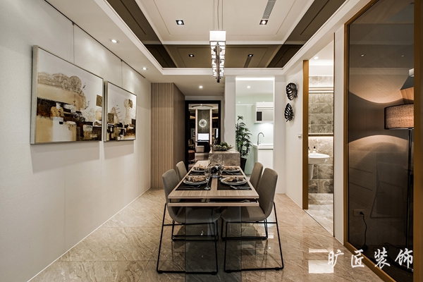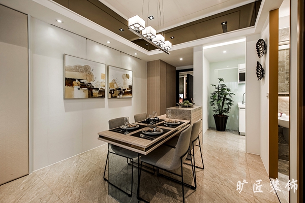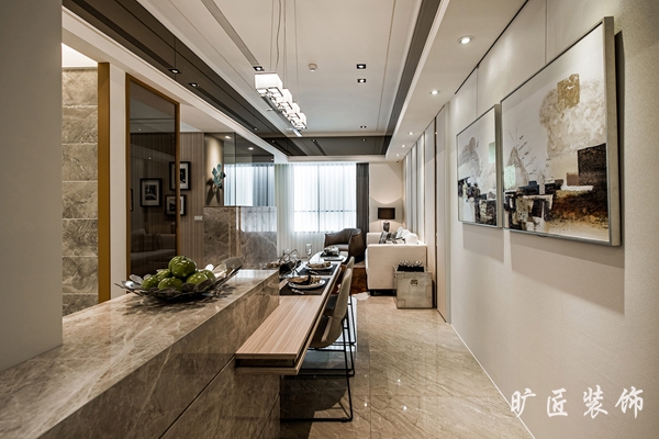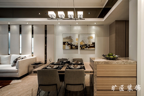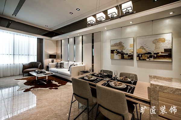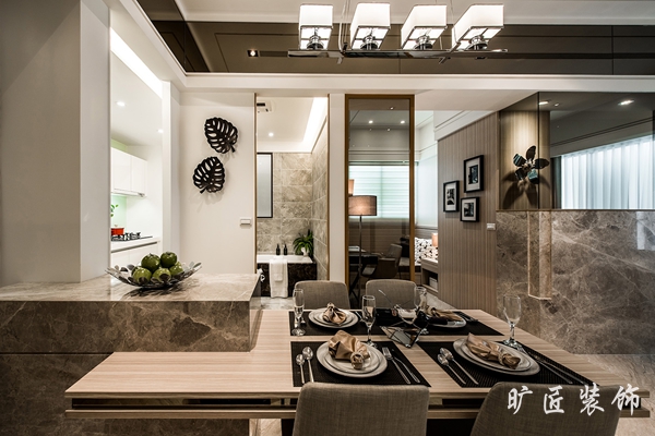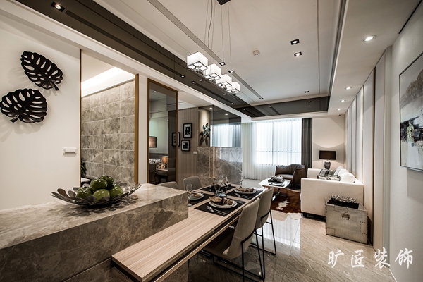 喜歡進門的感覺,兩排規則的墻面,干凈、舒適、純潔……然而走進才發現,鋪面迎來的卻是另一番天地,它包羅萬象,仿佛一間屋子就裝下了整個世界。有個特別打動人的細節,餐桌和大理石鑲嵌在一起,拋開設計暫且先從哲學的角度思考,這樣一種共生共滅相依存的關系著實讓人動容。設計師這樣設計自然有他的道理,一來讓空間有延伸的感覺,二來這也是一個創意的可吸人眼球的點。如今抽象的東西越來越多地出現在現代人的居室中,餐廳背景墻上的兩幅抽象畫很自然地完成了從餐廳到客廳的過渡。客廳的背景墻簡約卻不簡單,幾個大塊的幾何圖形完美地詮釋了簡單美。地毯的不規則打破了整個空間的規矩,烘托出了另一種時尚與個性。
