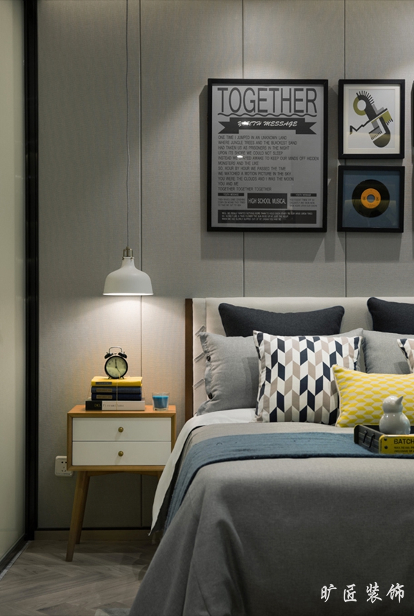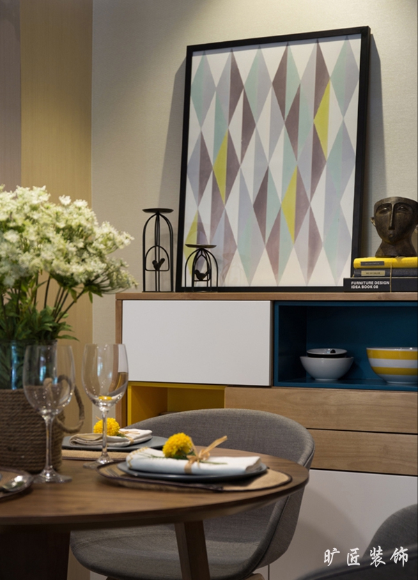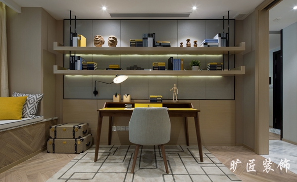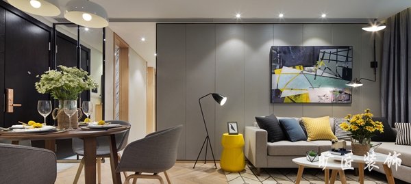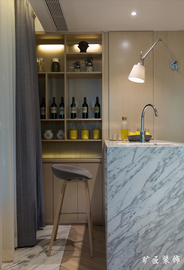 這無疑是充滿小資情調的一間現代居室了。進門處右邊有個小柜子,柜內可以放置碗碟柜面還可陳列一些擺件及畫作等藝術品,剛好和旁邊的餐桌形成一個可以互動的動線關系。餐廳的吧臺一方面可以作為一個景點,又可放置一些酒水,另一方面還和電視柜相對應,使得電視柜的陽角不會顯得特別突兀。客廳的小茶幾很有情調,高矮錯落又鑲嵌在一起,既美觀又實用。整個客廳充斥著各種各樣的線條,地面和抱枕上的規則線條、墻面掛畫中的不規則線條以及壁燈和和落地燈的線條組合,讓整個空間更有藝術感。半開敞式的書房顯得居室大而亮,利用墻體空間巧妙地設計出兩排可以充當書架的架子。書房里一定是要有飄窗才好的,下雨天坐在飄窗上,一邊品讀書中文字,一邊聆聽雨的聲音,實在是舒心。