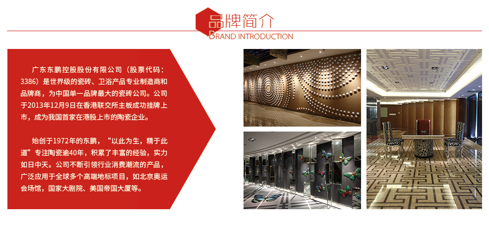 廣東東鵬控股股份有限公司(股票代碼:3386)是世界級(jí)的瓷磚、衛(wèi)浴產(chǎn)品專業(yè)制造商和品牌商,為中國單一品牌最大的瓷磚公司。公司于2013年12月9日在香港聯(lián)交所主板成功掛牌上市,成為我國首家在港股上市的陶瓷企業(yè)。
